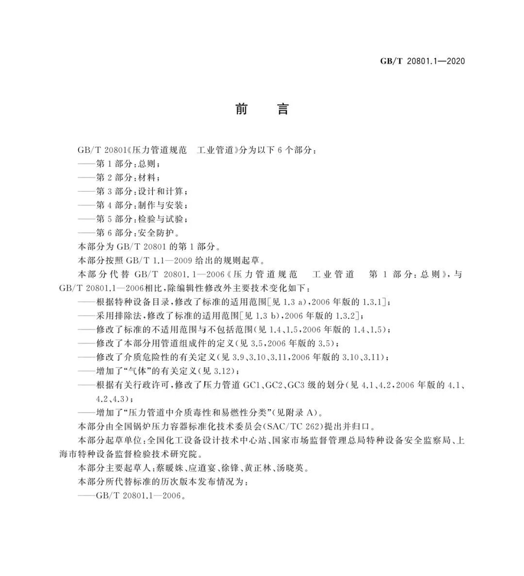近日,市場監(jiān)管總局和國家標準化管理委員會聯(lián)合發(fā)布中國國家標準2020年第1號公告。公告中涉及壓力管道規(guī)范-工業(yè)管道標準GB/T20801的修改。本次修改只針對GB/T20801.1(總則)的修改,2020年10月1號起實施。
