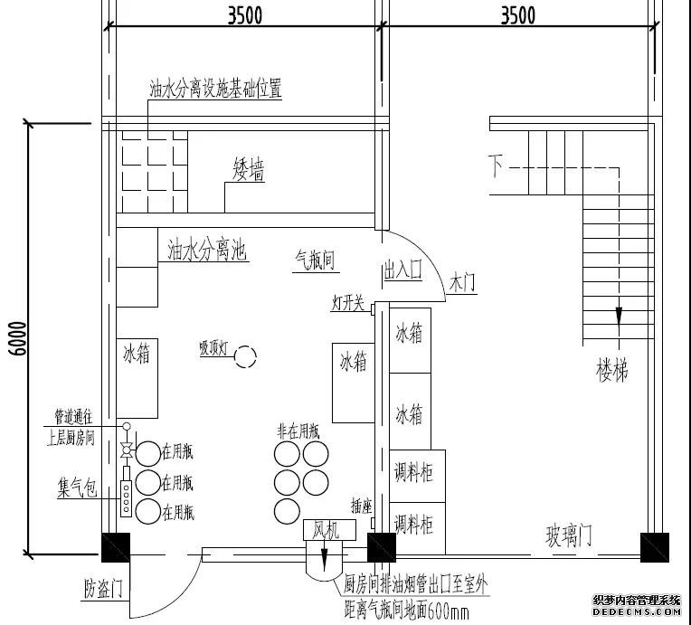 東面2層為磚混結(jié)構(gòu),一樓東面為氣瓶間,西面為樓梯間和食料間;氣瓶間四周均為實(shí)體墻,在西北角有一木門開(kāi)向樓梯食料間,氣瓶間東南角設(shè)有鐵質(zhì)防盜門,可開(kāi)向室外;二樓東面為廚房間,西面為過(guò)道和收銀臺(tái)。