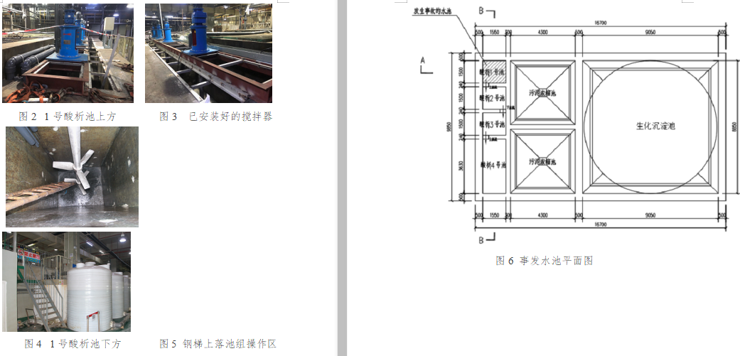 截至2019年5月14日,三期項(xiàng)目整體工程進(jìn)度已完成70%左右,其中排放系統(tǒng)(廢水處理系統(tǒng))已完成45~50%。事故發(fā)生前,1、2、3、4號(hào)酸析池上方均已安裝好攪拌器,攪拌器采用角鋼及鐵架固定,未放水進(jìn)行調(diào)試。(現(xiàn)場(chǎng)情況見(jiàn)圖2-5)