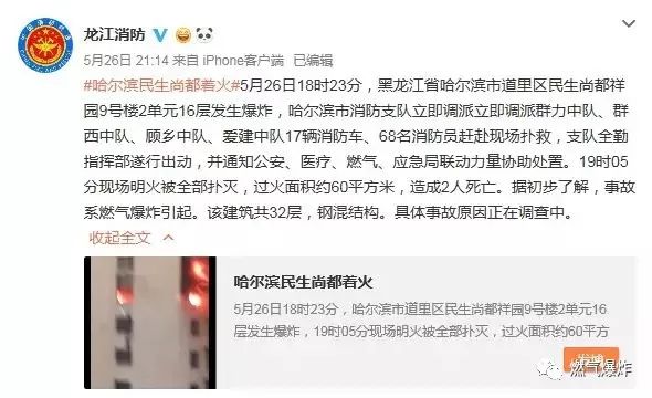 據(jù)@龍江消防:#哈爾濱民生尚都著火#5月26日18時(shí)23分,黑龍江省哈爾濱市道里區(qū)民生尚都祥園9號(hào)樓2單元16層發(fā)生爆炸,哈爾濱市消防支隊(duì)立即調(diào)派立即調(diào)派群力中隊(duì)、群西中隊(duì)、顧?quán)l(xiāng)中隊(duì)、愛(ài)建中隊(duì)17輛消防車(chē)、68名消防員趕赴現(xiàn)場(chǎng)撲救,支隊(duì)全勤指揮部遂行出動(dòng),并通知公安、醫(yī)療、燃?xì)狻?yīng)急局聯(lián)動(dòng)力量協(xié)助處置。19時(shí)05分現(xiàn)場(chǎng)明火被全部撲滅,過(guò)火面積約60平方米,造成2人死亡。據(jù)初步了解,事故系燃?xì)獗ㄒ?。該建筑?2層,鋼混結(jié)構(gòu)。