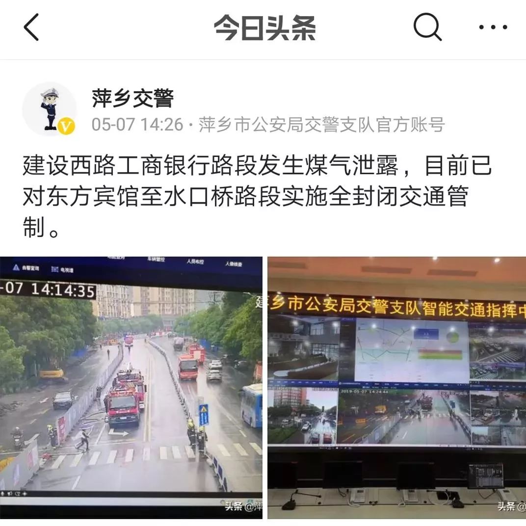 5月7日下午14時09分,萍鄉(xiāng)交警支隊指揮中心接到消防支隊119電話,在建設(shè)西路工商銀行路段發(fā)生天然氣泄漏事件,請求交警增援并實施路面交通管控。