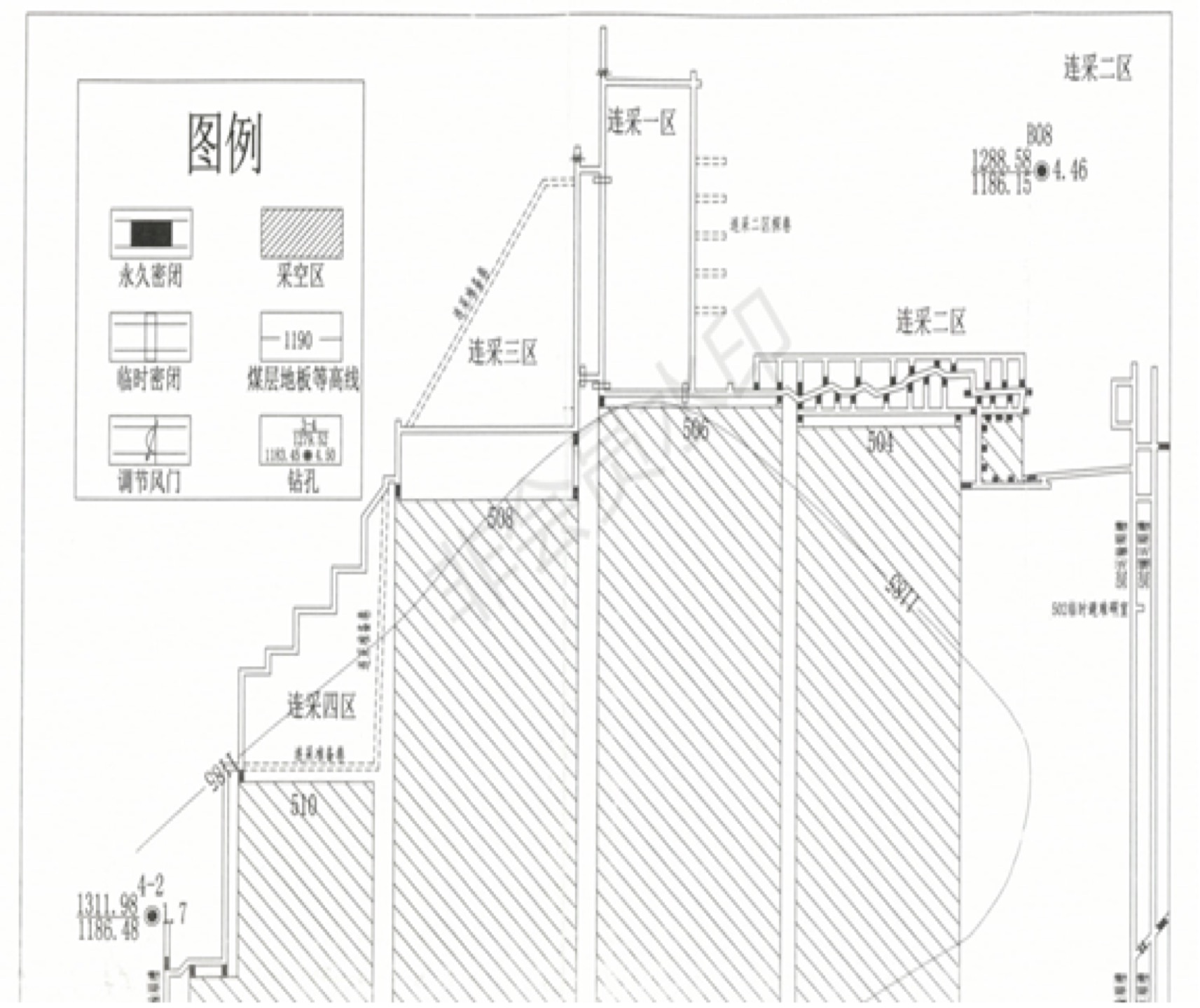 式回采。一區(qū)和二區(qū)的開采實為同一個工作面,在開采一區(qū)時,同步開采二區(qū),即506連采工作面實為一區(qū)、二區(qū)合并而成。