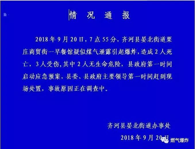 20日上午,10時(shí)左右,齊河縣晏北街道辦事處對(duì)外發(fā)布《情況通報(bào)》稱,2018年9月20日,齊河縣晏北街道栗莊商貿(mào)街一早餐館疑似煤氣泄漏引起爆炸,造成2人死亡,3人受傷,其中2人無生命危險(xiǎn),縣政府第一時(shí)間啟動(dòng)應(yīng)急預(yù)案,縣委、縣政府主要領(lǐng)導(dǎo)第一時(shí)間趕到現(xiàn)場處置,事故原因正在調(diào)查中。