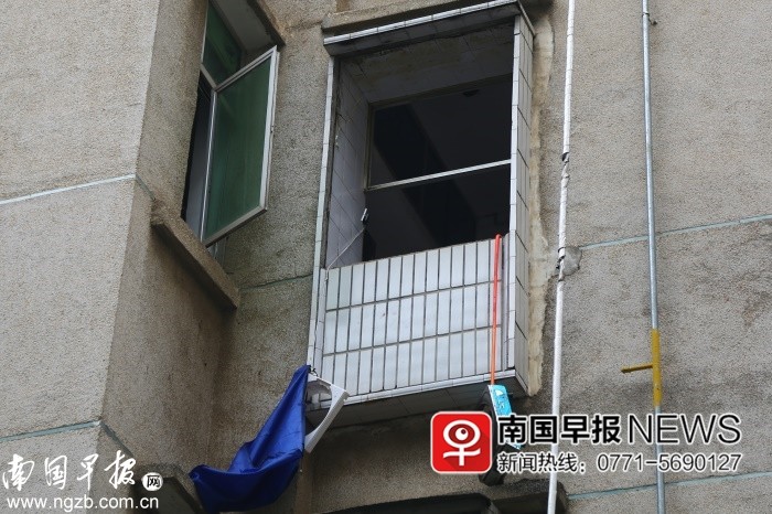 ▲爐灶因燃爆飛出窗戶,掛在窗臺(tái)上。 南國(guó)早報(bào)記者 鄒財(cái)麟攝