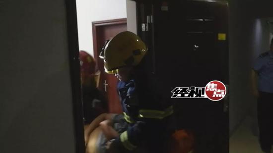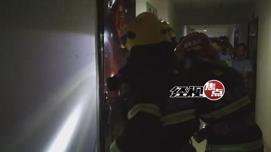 四分鐘后大門被破開,房間彌漫大量燃?xì)?,消防隊員丁煥章立即沖了進去,他在廚房找到了被困的女業(yè)主。